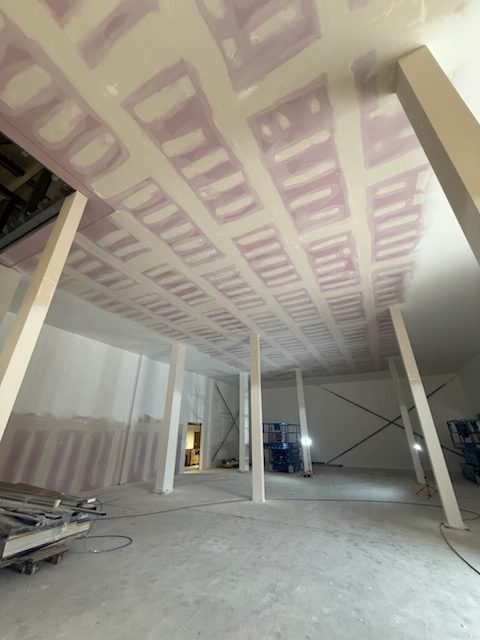Using our airless paint spraying systems, we applied over 400 litres of coating quickly and evenly across all drywall surfaces. - Efficient Coverage: